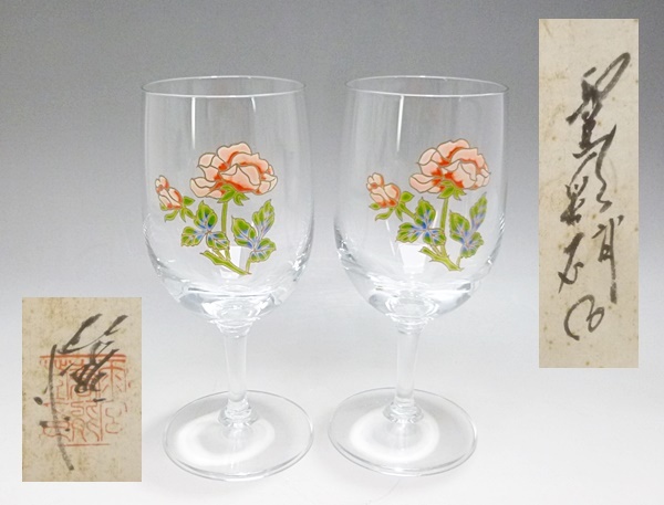 > 《ジャムルK》◆kks0730-137◆雨宮喜能登 窯彩硝子 ワイングラス 2客 花図 クリスタル 一客/約188g 酒器 工芸ガラス 作家物
