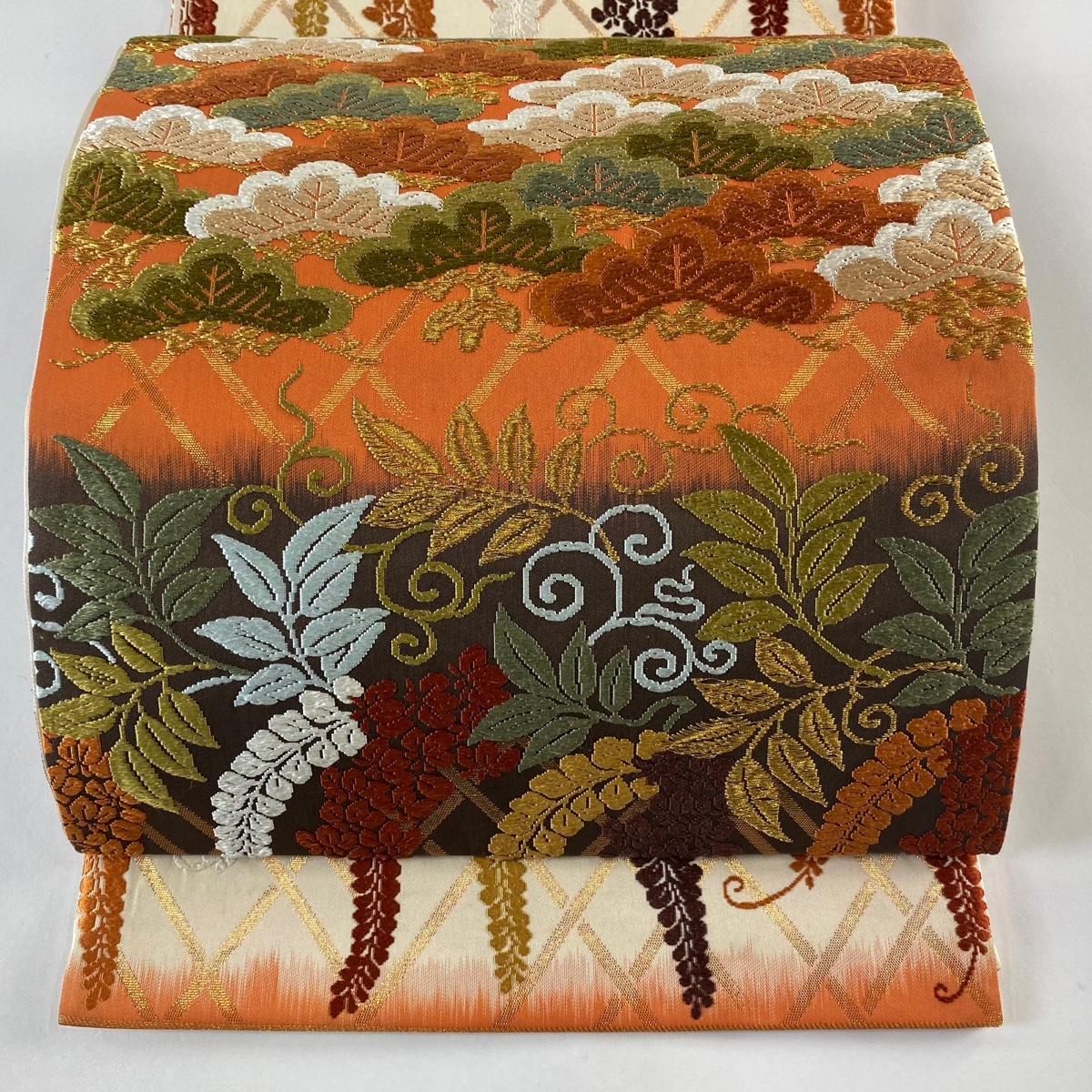 > 袋帯 逸品 河合美術織物 落款 笠松 藤 唐織 金糸 オレンジ 六通 正絹 【中古】