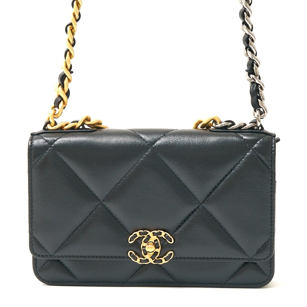 > CHANEL シャネル19 チェーンウォレット AP0957 ランダム番 ハンド ショルダーバッグ ラムスキン ブラック×シルバー×ゴールド レディース