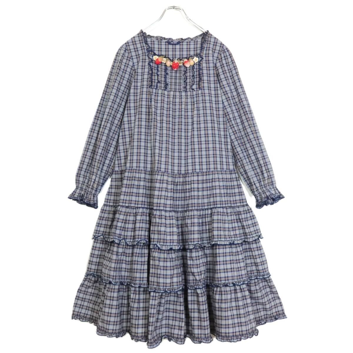- 【極美品】ピンクハウス★苺モチーフ&オリチェpt♪かぶせ段々フリルのワンピース 青系 ゆったりフォルム♪z14618