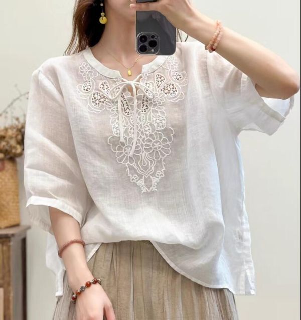 - 新入荷*カジュアル 半袖シャツ 刺繍シャツ 薄手 トップス 大きいサイズ ブラウス オフィス OL ビジネス 通勤 着痩せ チュニック*白