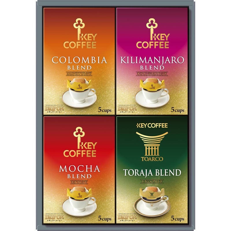 ▼▼▼▼▼▼注意事項▼▼▼▼▼▼・送料込み(送料800円が商品価格に含まれています) 一部地域では追加送料あり。・お取り寄せ商品です。弊社にて手配後、メーカー・卸業者からの直送になります。・まれにメーカー欠品、出荷遅延等が発生致します。問題発生時は別途メールにてご連絡致します。・配送方法の指定、日時指定、置き配、ギフト対応、他商品との同梱配送などは対応できません。・まとめ買いや複数購入の場合は通常より発送に時間が掛かる場合がございます・複数個口の場合、2階以上への搬入ができない場合があります。(その場合は1階での受け渡しとなります)・大型連休、お盆、年末年始などは発送をお休みさせていただく場合がございます・メーカー都合により、パッケージは予告なく変更される場合がございます・梱包用のダンボールはリサイクル品を使用させていただきます。・注文に関するご連絡(注文確定通知・発送通知など)はメールでご案内させていただきます※商品ページの内容について、少しでもご不明な点などがございましたら購入前に一度ご連絡ください▲▲▲▲▲▲注意事項▲▲▲▲▲▲〇商品説明“挽きたての香り”と“格別なおいしさ”をお届けするプレミアムドリップコーヒーの「ドリップ オン」ギフトです。バラエティに富んだ詰め合わせを、お楽しみいただけます。〇商品仕様【パッケージサイズ】225×75×330mm【内容】トラジャブレンド・モカブレンド・キリマンジャロブレンド・コロンビアブレンド各(8g×5p)×各1【生産国】日本【パッケージ形態】化粧箱入【保存方法】常温【賞味期限】製造日より約540日(出典:キーコーヒー)