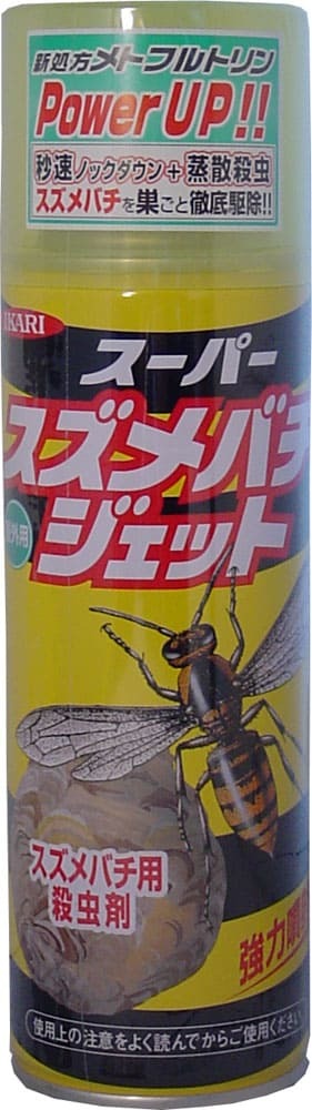 ▼▼▼▼▼▼注意事項▼▼▼▼▼▼・送料込み(送料700円が商品価格に含まれています) 一部地域では追加送料あり。・お取り寄せ商品です。弊社にて手配後、メーカー・卸業者からの直送になります。・まれにメーカー欠品、出荷遅延等が発生致します。問題発生時は別途メールにてご連絡致します。・配送方法の指定、日時指定、置き配、ギフト対応、他商品との同梱配送などは対応できません。・まとめ買いや複数購入の場合は通常より発送に時間が掛かる場合がございます・複数個口の場合、2階以上への搬入ができない場合があります。(その場合は1階での受け渡しとなります)・大型連休、お盆、年末年始などは発送をお休みさせていただく場合がございます・メーカー都合により、パッケージは予告なく変更される場合がございます・梱包用のダンボールはリサイクル品を使用させていただきます。・注文に関するご連絡(注文確定通知・発送通知など)はメールでご案内させていただきます※商品ページの内容について、少しでもご不明な点などがございましたら購入前に一度ご連絡ください▲▲▲▲▲▲注意事項▲▲▲▲▲▲〇商品説明超強力殺虫剤!スズメバチでもOK!・強力噴射式のスズメバチ用殺虫剤。・高所3mにも薬剤が届き、スズメバチに対して優れた効果を示します。・スズメバチの巣の処理も可能です。【使用方法】・スズメバチの巣を処理する場合は、皮膚を露出しない防護服、手袋(スズメバチの針が 皮膚まで届かないもの)防護メガネを着用してください。・日没後3m位離れた場所から巣に向かって噴霧して下さい。・本品1本で直径15cmの巣を処理できます。巣の直径が4cm大きくなる毎に1本追加してください。・巣の処理は必ず少し多めに薬剤を準備して行ってください。また直径が25cmを超える大きな巣の処理は危険ですので、専門家に依頼してください。・風上から風下に向かって噴霧してください。・薬剤は速効的に優れた効果を示しますが、十分かからないと効果が出ません。 死角にいるハチや薬剤が十分にかかっていないハチに十分注意してください。 ・スズメバチに刺されたときはすぐに医師の手当を受けてください。【概要】有効成分:d-d-T80-プラレトリン適用害虫:スズメバチ、アシナガバチ、クマバチ、ミツバチ、アブ、ブユ【使用に際しての注意】・使用前に必ず使用方法をよく読み、十分理解した上で使用し、目的とする効能・効果にそって定められた用法・用量を厳守して使用すること。間違った使い方をすると、効力不足や健康をそこなうことがあります。・本品は強力ジェット噴射タイプですので、連続噴射いたしますと、40〜45秒で薬剤がなくなります。・本剤は速効的に優れた効果を示しますが、薬剤が十分かからないと効果が出ないので、死角にいるハチや薬剤が十分にかかっていないハチに十分注意すること。・本品を使用するときは、保護服・手袋などを着用しなるべく身体の露出部を少なくして薬剤を浴びないようにすること。特にハチの巣を処理する時は、皮膚を露出しないように防護服、手袋(スズメバチの針が皮膚までとどかないもの)、保護メガネを着用すること。・スズメバチの巣を処理する場合は、必ず日没後に行うこと。〇商品仕様個装サイズ:65X225X65mm個装重量:約450g内容量:480ml製造国:日本【発売元:イカリ消毒株式会社】(出典:イカリ消毒)