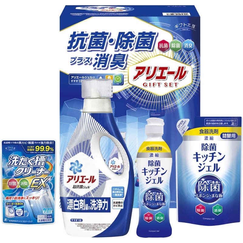 ▼▼▼▼▼▼注意事項▼▼▼▼▼▼・送料込み(送料800円が商品価格に含まれています) 一部地域では追加送料あり。・お取り寄せ商品です。弊社にて手配後、メーカー・卸業者からの直送になります。・まれにメーカー欠品、出荷遅延等が発生致します。問題発生時は別途メールにてご連絡致します。・配送方法の指定、日時指定、置き配、ギフト対応、他商品との同梱配送などは対応できません。・まとめ買いや複数購入の場合は通常より発送に時間が掛かる場合がございます・複数個口の場合、2階以上への搬入ができない場合があります。(その場合は1階での受け渡しとなります)・大型連休、お盆、年末年始などは発送をお休みさせていただく場合がございます・メーカー都合により、パッケージは予告なく変更される場合がございます・梱包用のダンボールはリサイクル品を使用させていただきます。・注文に関するご連絡(注文確定通知・発送通知など)はメールでご案内させていただきます※商品ページの内容について、少しでもご不明な点などがございましたら購入前に一度ご連絡ください▲▲▲▲▲▲注意事項▲▲▲▲▲▲〇商品説明抗菌洗剤アリエールと、少量でたくさん洗える濃縮タイプの食器洗剤除菌ジェルのギフトです。〇商品仕様【パッケージサイズ】193×275×117mm【内容】P&Gアリエールジェル:720g・除菌キッチンジェル:200mL・詰替:160mL・洗たく槽クリーナーEX:100g×各1【生産国】日本【パッケージ形態】化粧箱入(出典:ギフト工房)