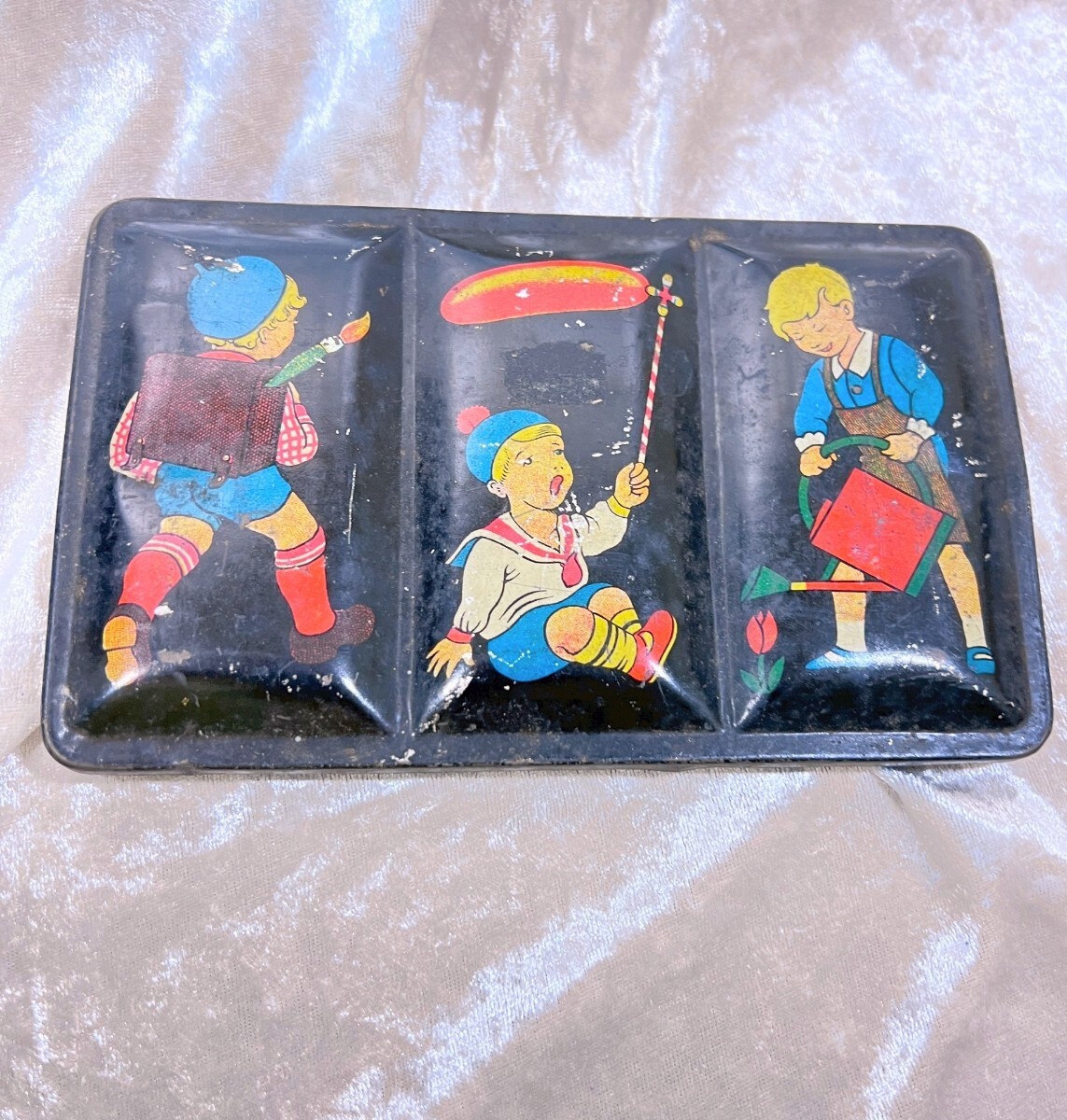 - 【雑貨・玩具】ブリキ缶 絵の具の缶 遊んでいる男の子のデザイン ディスプレイ用品 インテリア用品 骨董 アンティーク