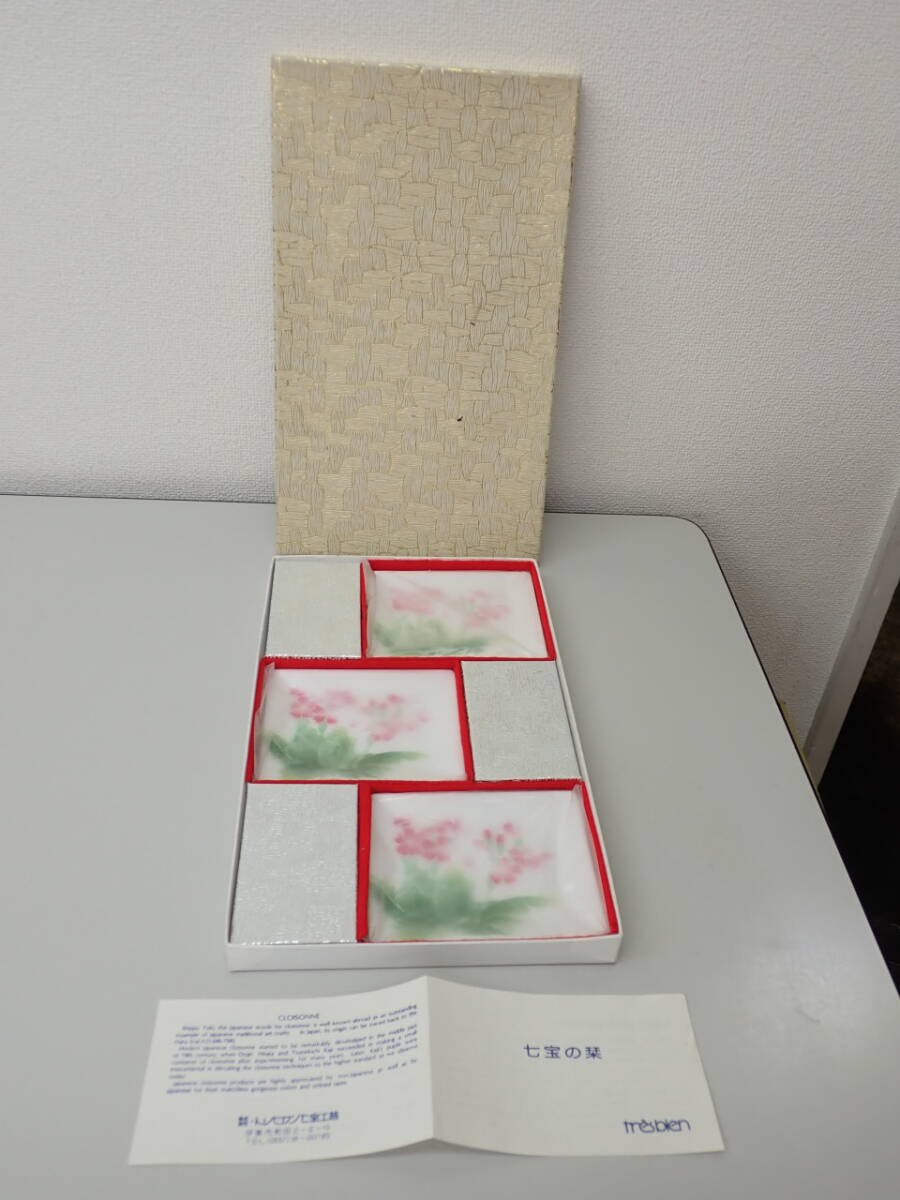 > 241-; トレビヤン 七宝工芸 小皿 長方角皿 3枚セット 約11.8×9.7×高さ;0.5cm 花柄 元紙箱・栞付き ★