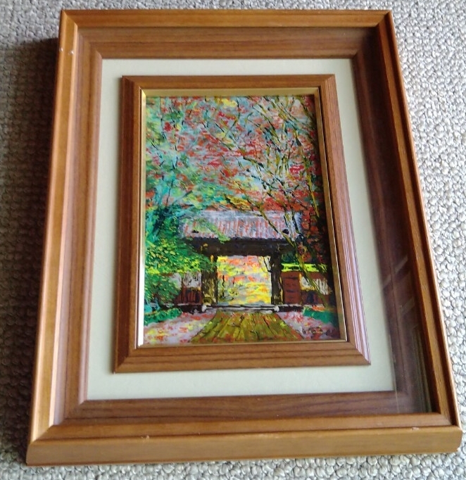 - 【お買得 貴重】紅葉の山門を描いたガラス絵(硝子絵)裏面にサイン有り 作者未詳 真作か模写か不明 風景画