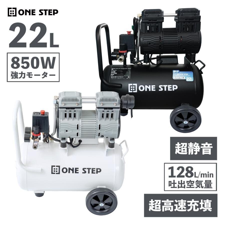 > ONE STEP エアーコンプレッサー 100v オイルレス 静音 22l 小型 軽量 圧力計 業務用 車 バイク 自転車 空気入れ ホワイト