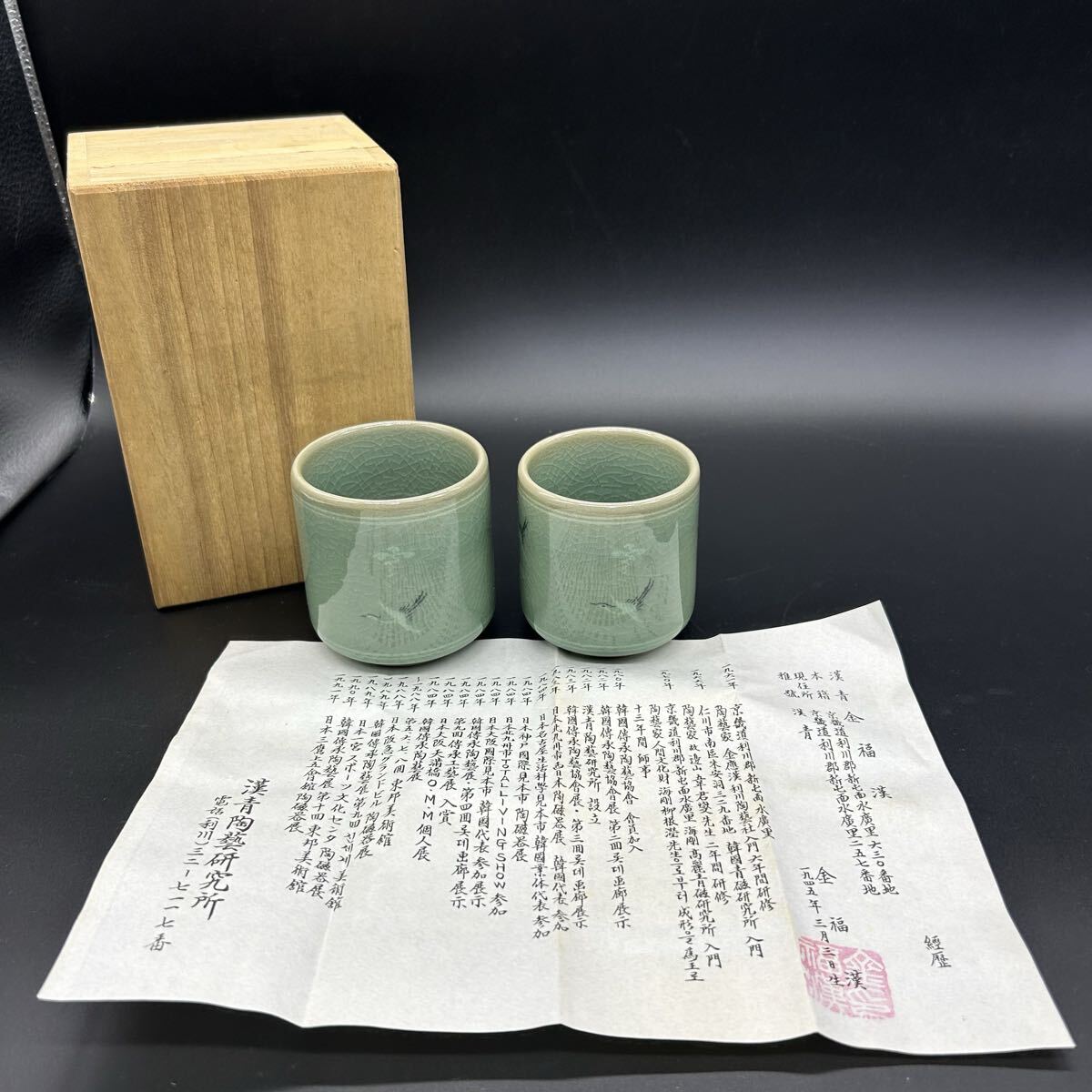 - 漢青 金福漢 青磁 雲鶴文 湯飲み 湯呑 茶器 陶器 エ9