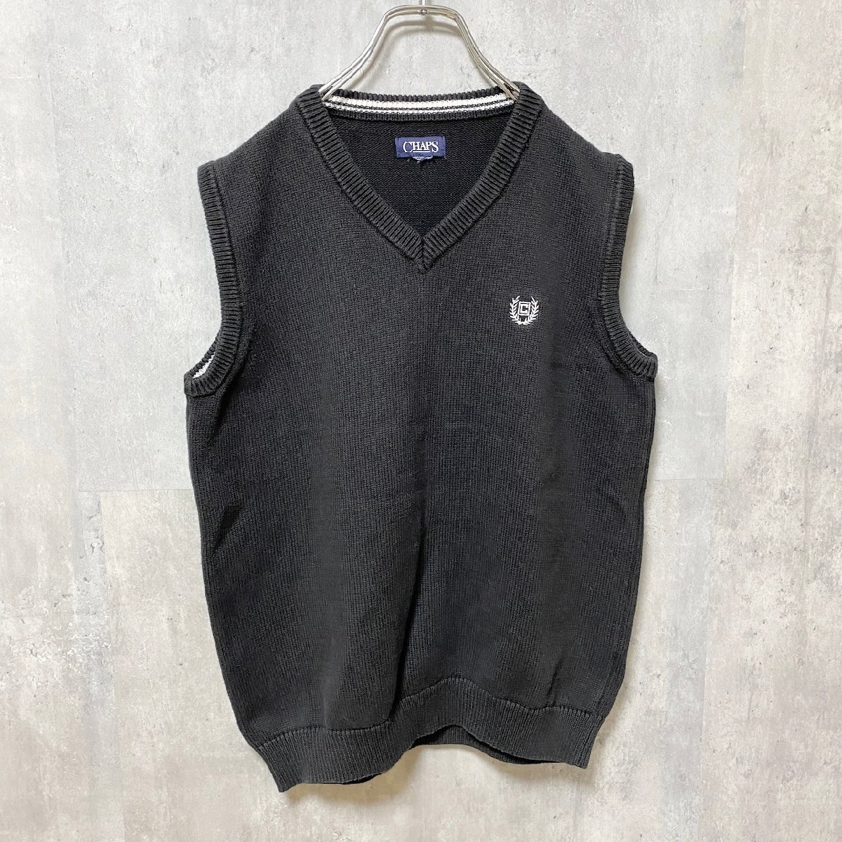 - 古着 used CHAPS チャップス ワンポイント刺繍ニットベスト Vネック 黒 ブラック シンプル ノームコア
