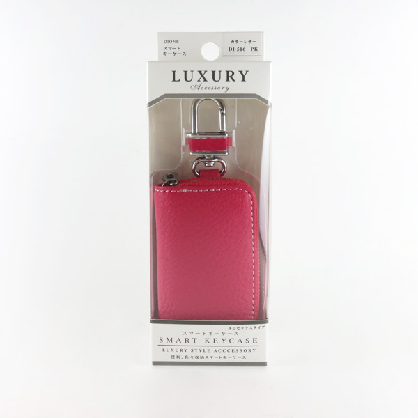 - スマートキーケース レザー調 ピンク 鍵入れ カラビナ チェーン付 小物入れ 便利 収納 ワンタッチ プラウド DI-516