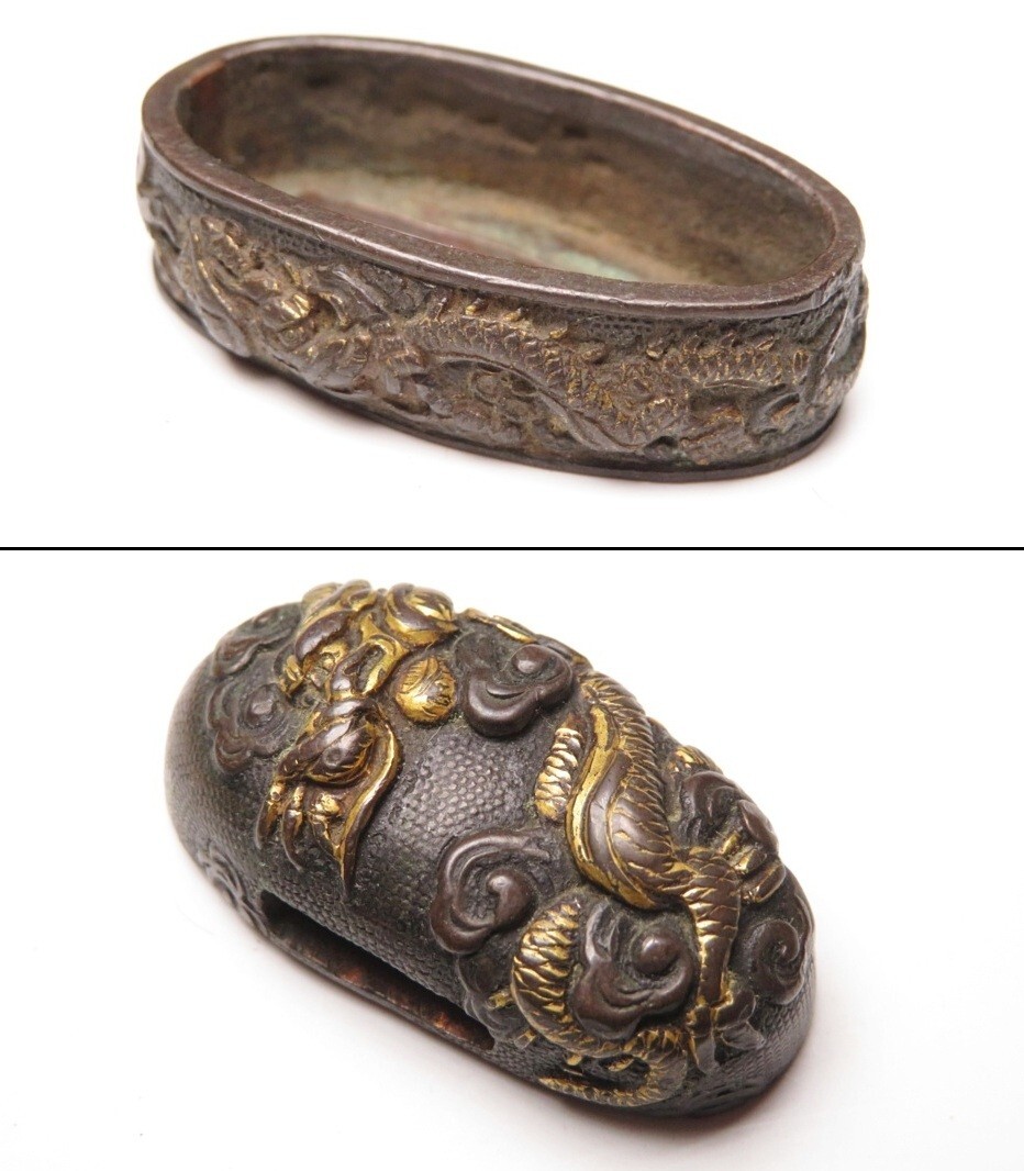 - 【11144】刀装具 江戸~明治 赤銅地 雲竜 象嵌 縁頭(初品・買取品)