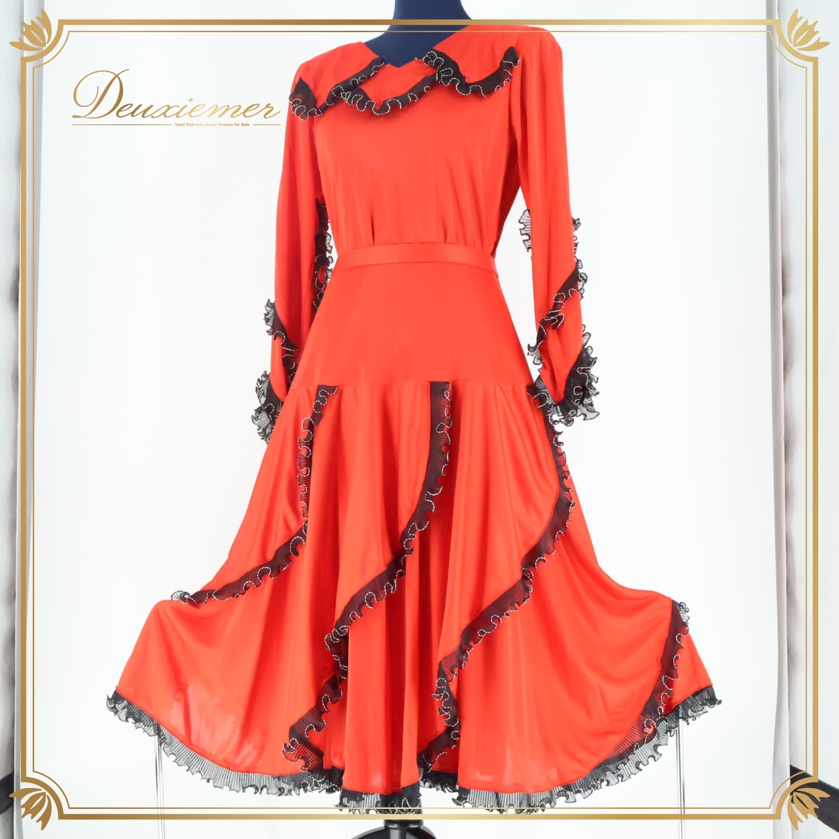 - 社交ダンス 衣装 ツーピース ワンピース ドレス セキネ 黒 赤 上下セット レッスン 練習着 日本製 sekine フリル レッド系 ラメ 舞台