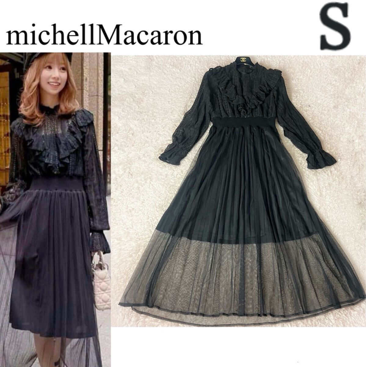 > michell Macaron ミシェルマカロン レース 刺繍 ロングワンピース ドレス Aライン シフォン フレア 花柄 シースルー ブラック 黒 S