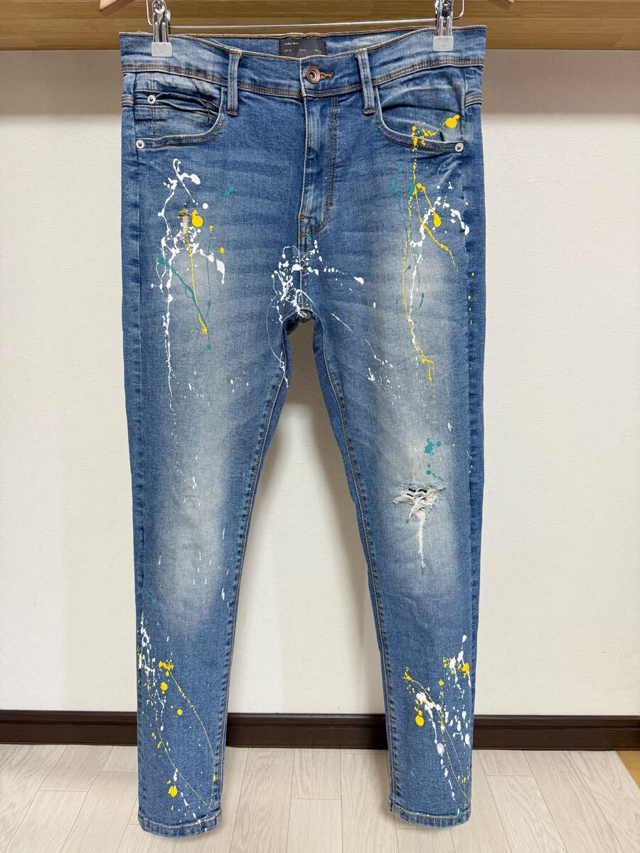 - 伸縮性抜群 ペイント ZARA MAN ストレッチ デニム 送料230円 42 32 ウルトラ スキニー ダメージ パンツ メンズ ジーンズ