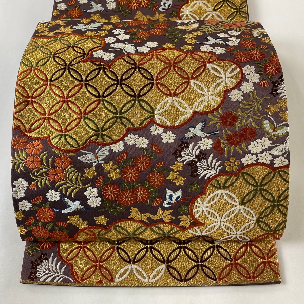 > 袋帯 逸品 河合美術織物 落款 関西仕立て 七宝 花鳥 金糸 唐織 茶紫 六通 正絹 【中古】