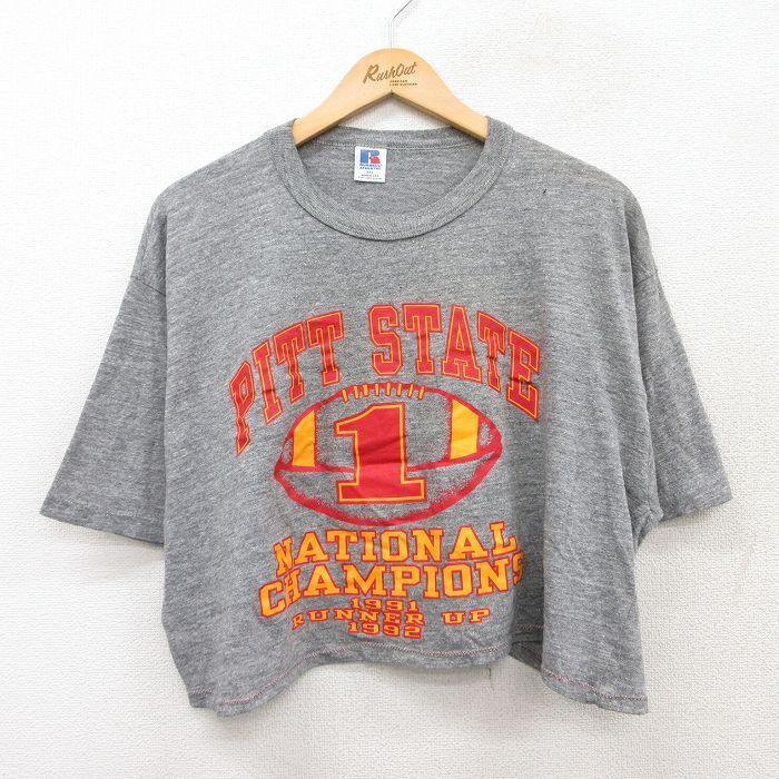- XL/古着 ラッセル 半袖 ビンテージ Tシャツ メンズ 90s PITT アメフト ショート丈 コットン クルーネック グレー 霜降り spe 25aug04 中古