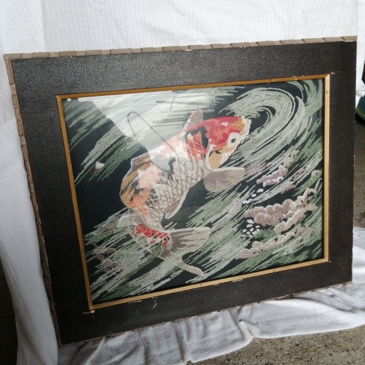 - 錦鯉 こい コイ 鯉 魚 刺繍 縫物 額装入り 美術品 (約61.8×51.2cm)