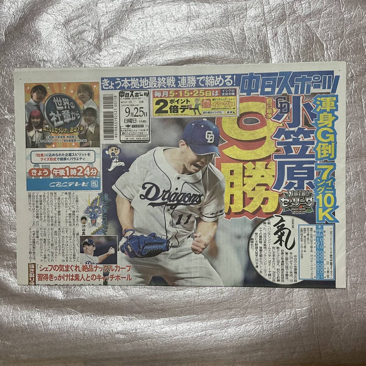 - 【新品未読】中日スポーツ 2022年9月25日発刊 表紙:中日ドラゴンズ小笠原9勝 須田亜香里卒業コンサート中刷り記事