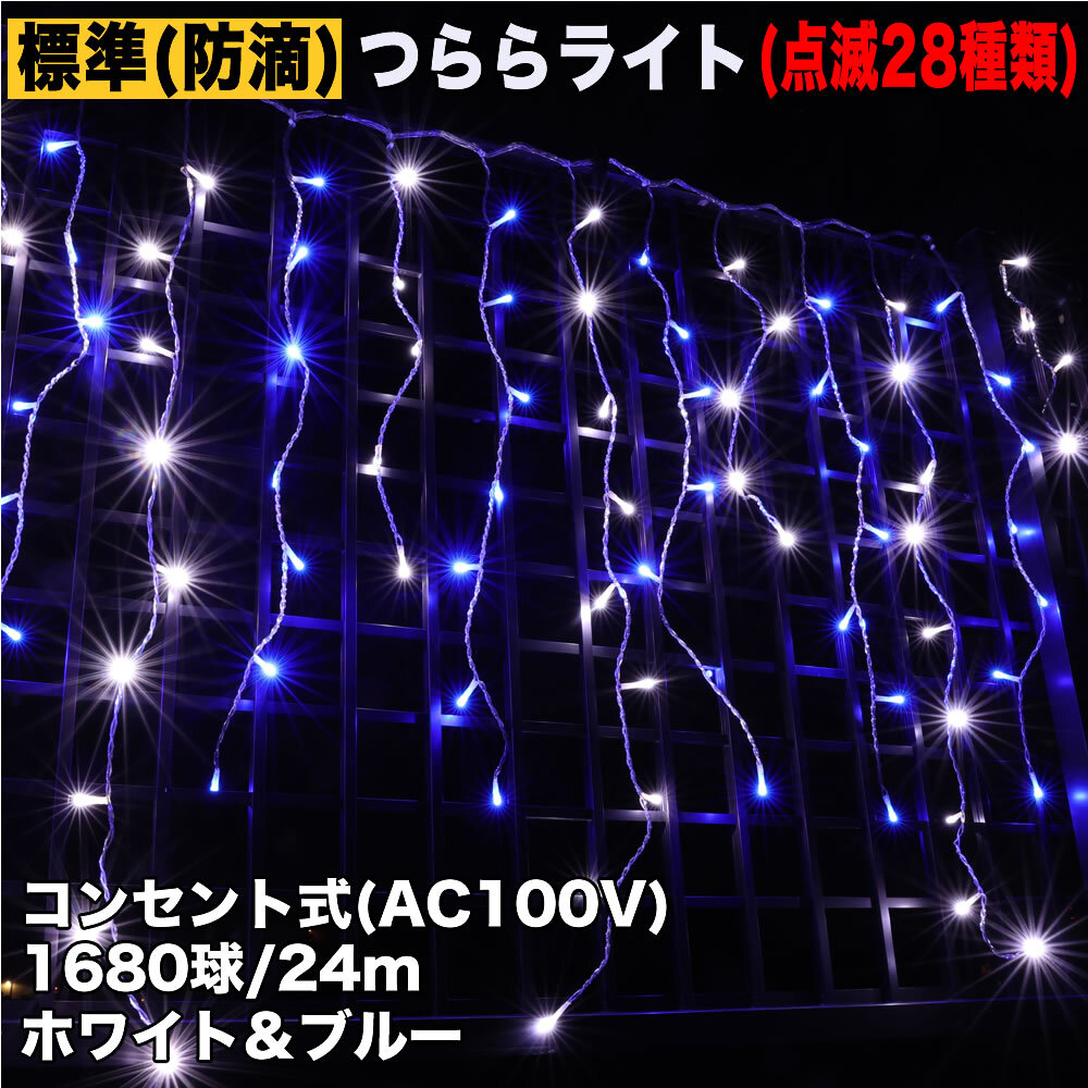 > クリスマス 防滴 イルミネーション つらら ライト 電飾 LED 24m 1680球 2色 白 ・ ブルー 28種点滅 Bコントローラセット