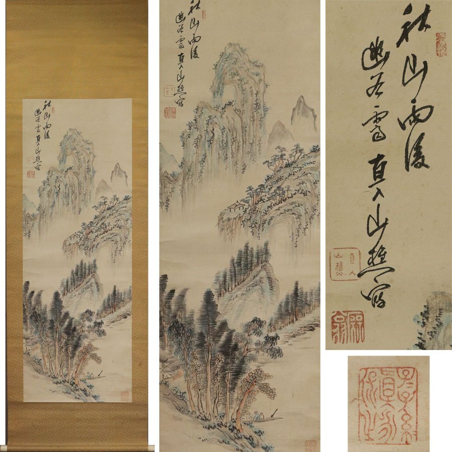 - 《源》【即決・送料無料】掛け軸 田能村直入 自画讃句 彩色 舟上人物 山水図/軸装