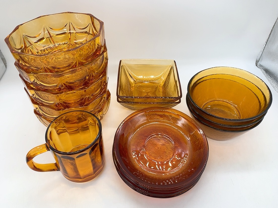 - 中古 Arcoroc? アルコロック? 食器 セット まとめて 16点 カップ ソーサー ボウル アンバー 琥珀色 昭和 レトロ ガラス食器 0803や5 A1 100