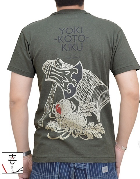 - 良き事を聞くポケット半袖Tシャツ◆喜人 カーキLサイズ KJ-12009 和柄 和風 絵詞 斧 琴 菊 江戸 きじん