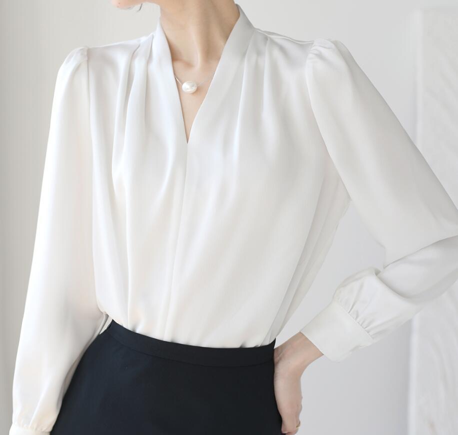- 人気推薦/上品 Vネック 長袖 ブラウス レディース サテン シャツ オフィス きれいめ おしゃれ 大人 ビジネス デート 光沢感 /ホワイト