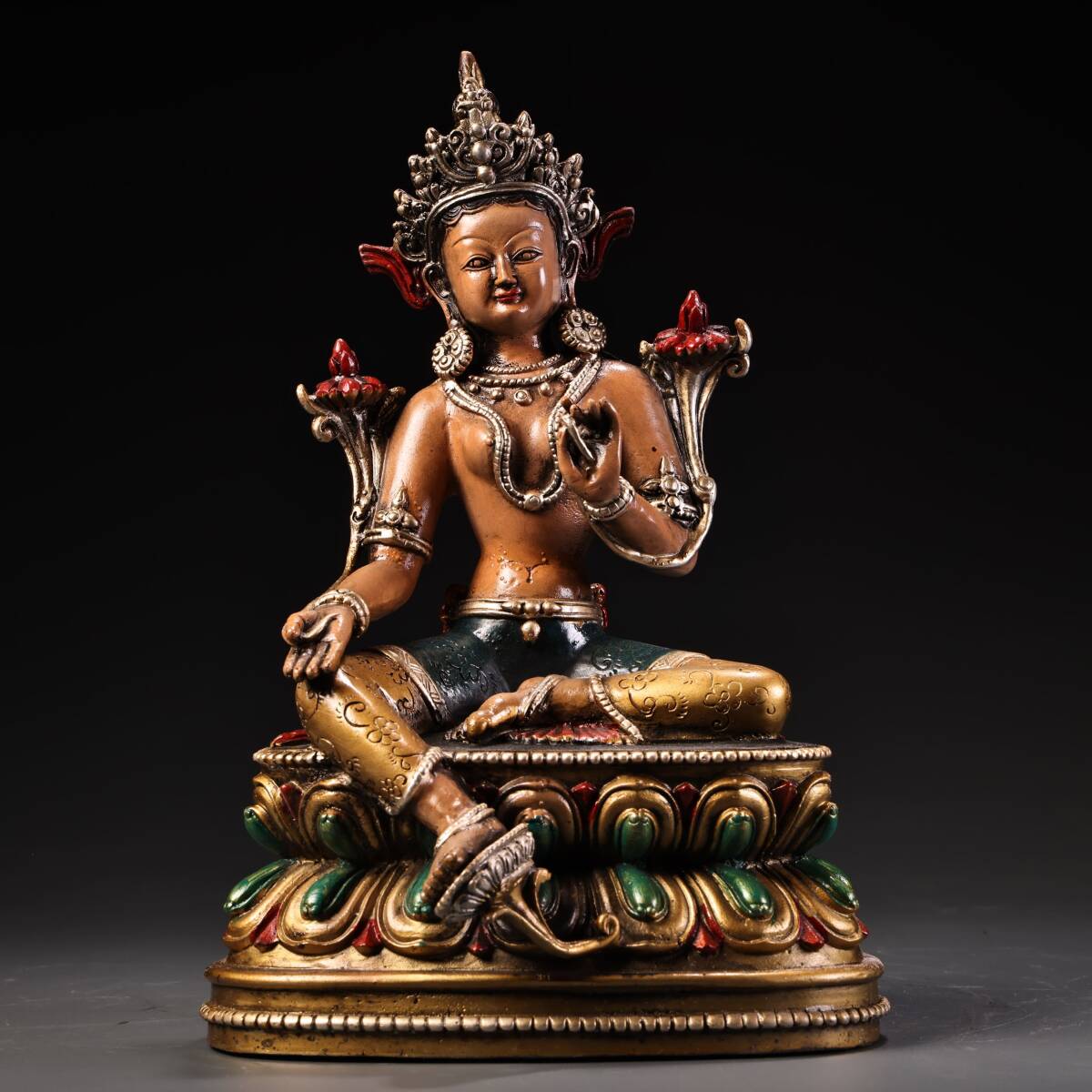- 唐物 清 純銅 全銅 高浮彫 鏨刻 彩繪描金綠度母 仏像 奉納されていた 供養品 銅製 極細工 古美術品 時代物 中国古玩 骨董品 D68