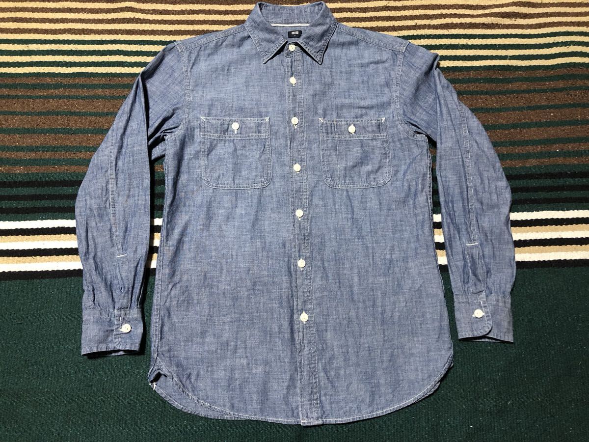 > アメカジ 定番 ユニクロ シャンブレーシャツ マチ付き セルビッチ Sサイズ ワークシャツ ビンテージ 古着 F&E デニム USA 赤耳 猫目ボタン