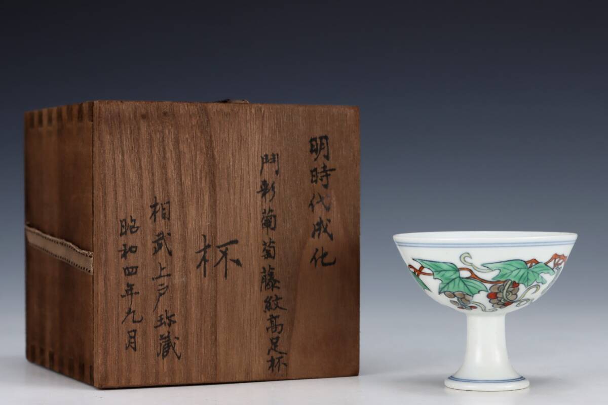 > 多宝閣 ■ 207048 中国磁器 中国骨董【明成華葡萄蔓文杯】工芸品 施釉陶 陶芸 置物 收藏品 孤品
