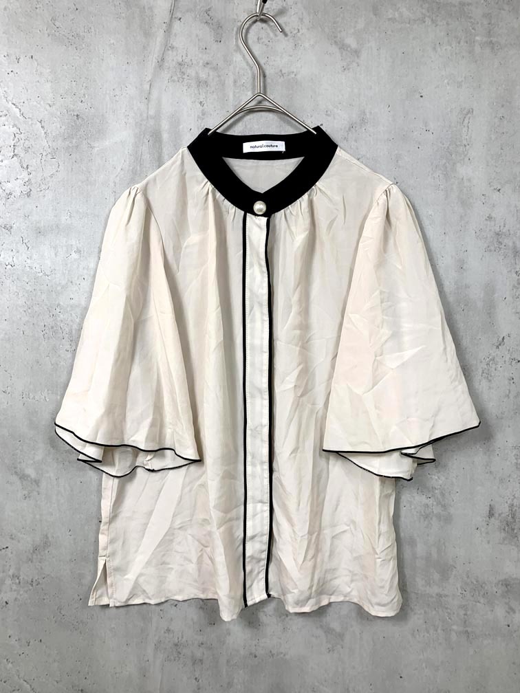 - ゆうパケットOK natural couture ナチュラルクチュール パール釦ポイントバイカラーフレア5分袖 ブラウス sizeF/ベージュ ■◆