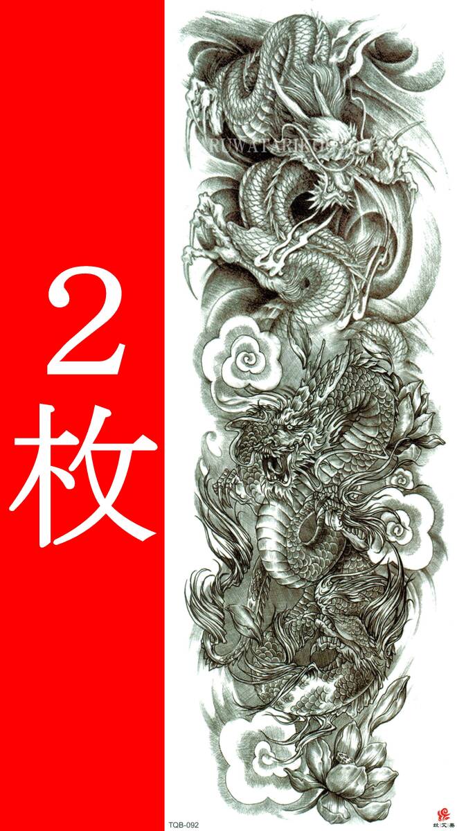 - タトゥーシール 2枚 48X17cm 入墨 タトゥーステッカー 消せる刺青 ボディーアート ハロウィン あおり運転対策 龍 竜 2匹の龍 グレー 黒