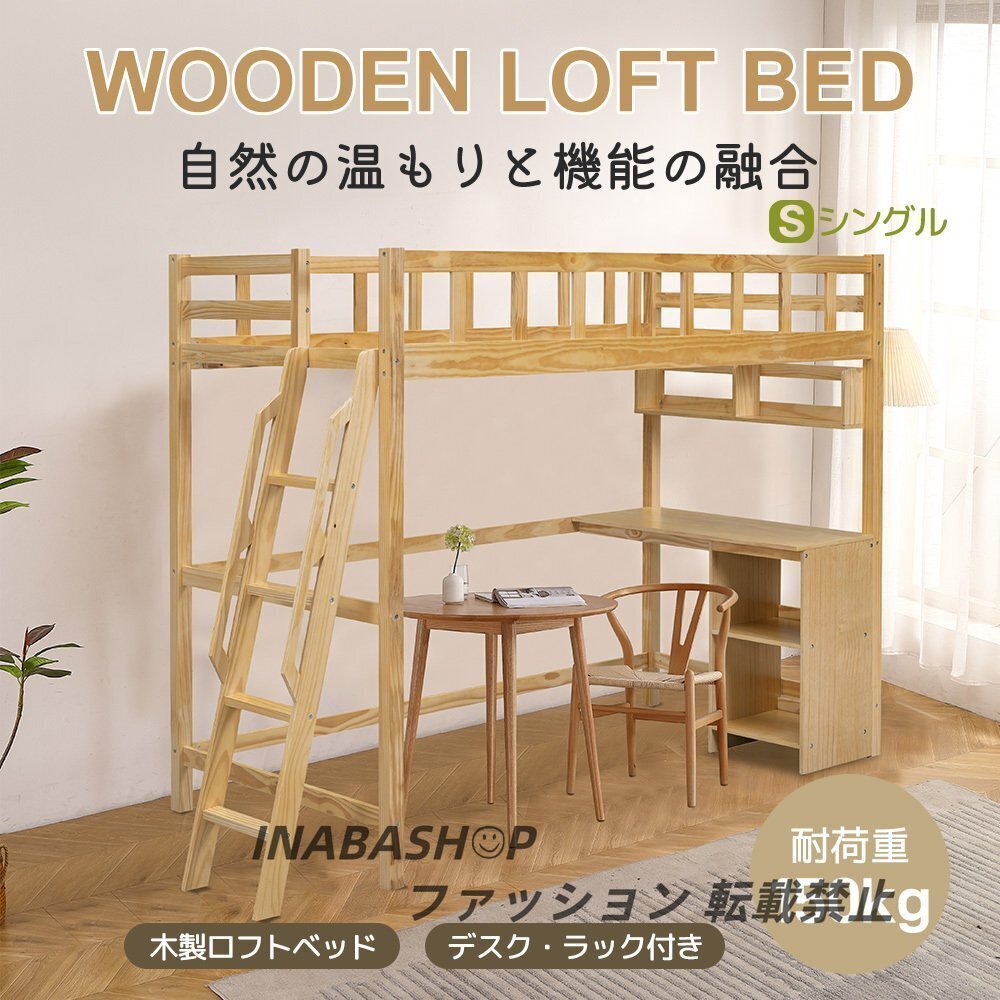 - ロフトベッド 頑丈 階段 天然木 デスク付き パイン材 収納 シングル 収納棚付き 収納 木製ロフトベッド ナチュラル