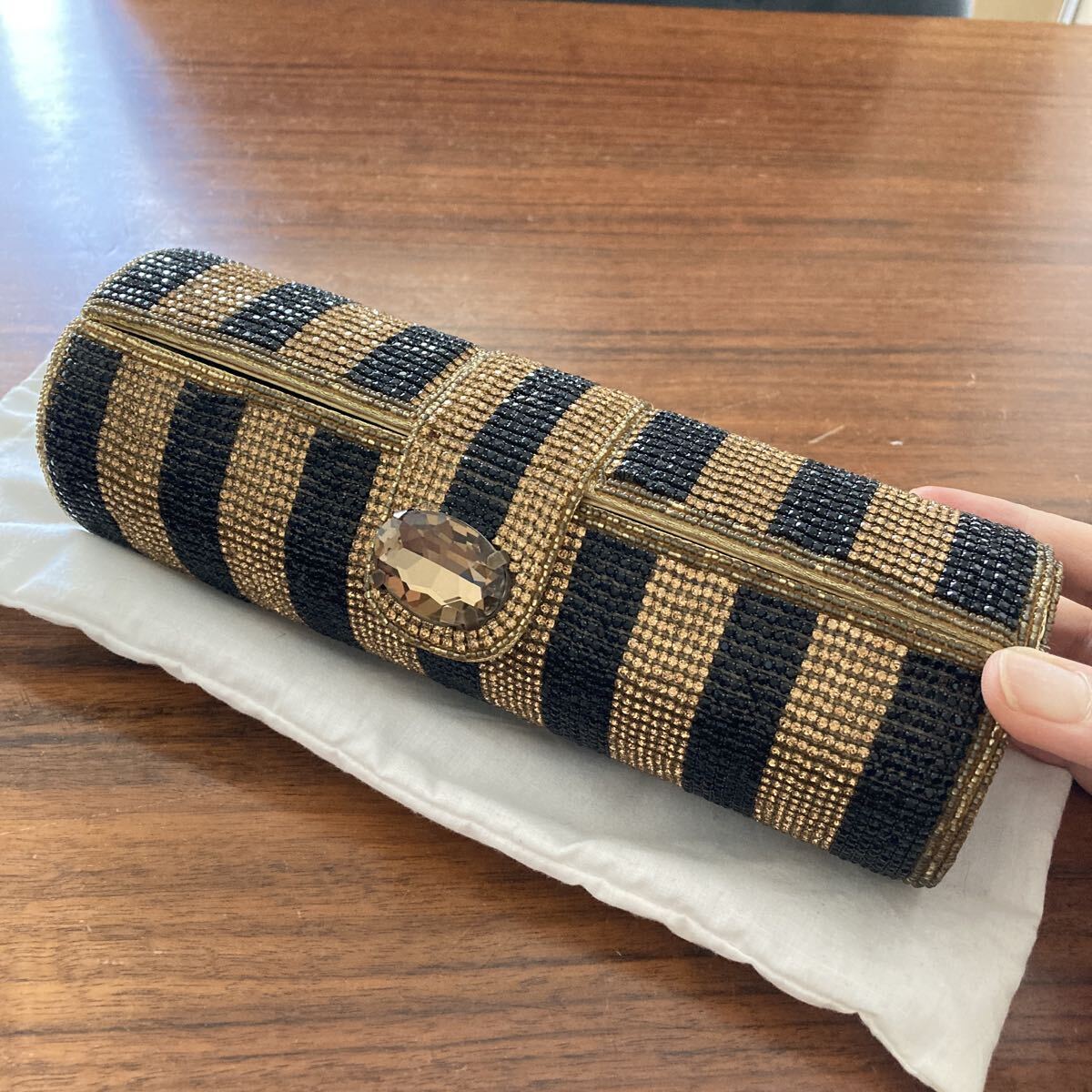 - インド製 ハンドメイド クラッチバッグ ビーズ 刺繍 着物 しましま 円形 筒形