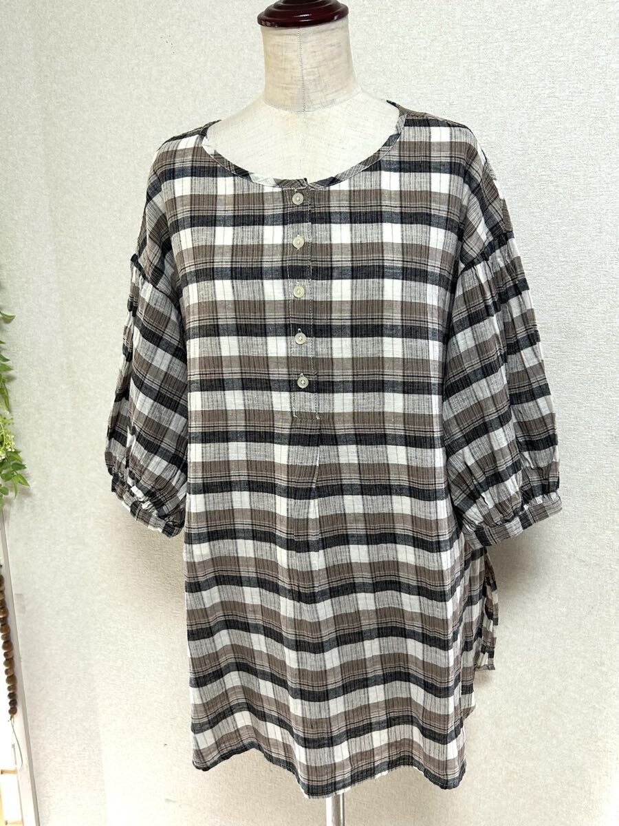 - 【 Samansa Mos2★サマンサモスモス】七分袖プルオーバーチュニック・麻混素材・チェック柄・Fサイズ