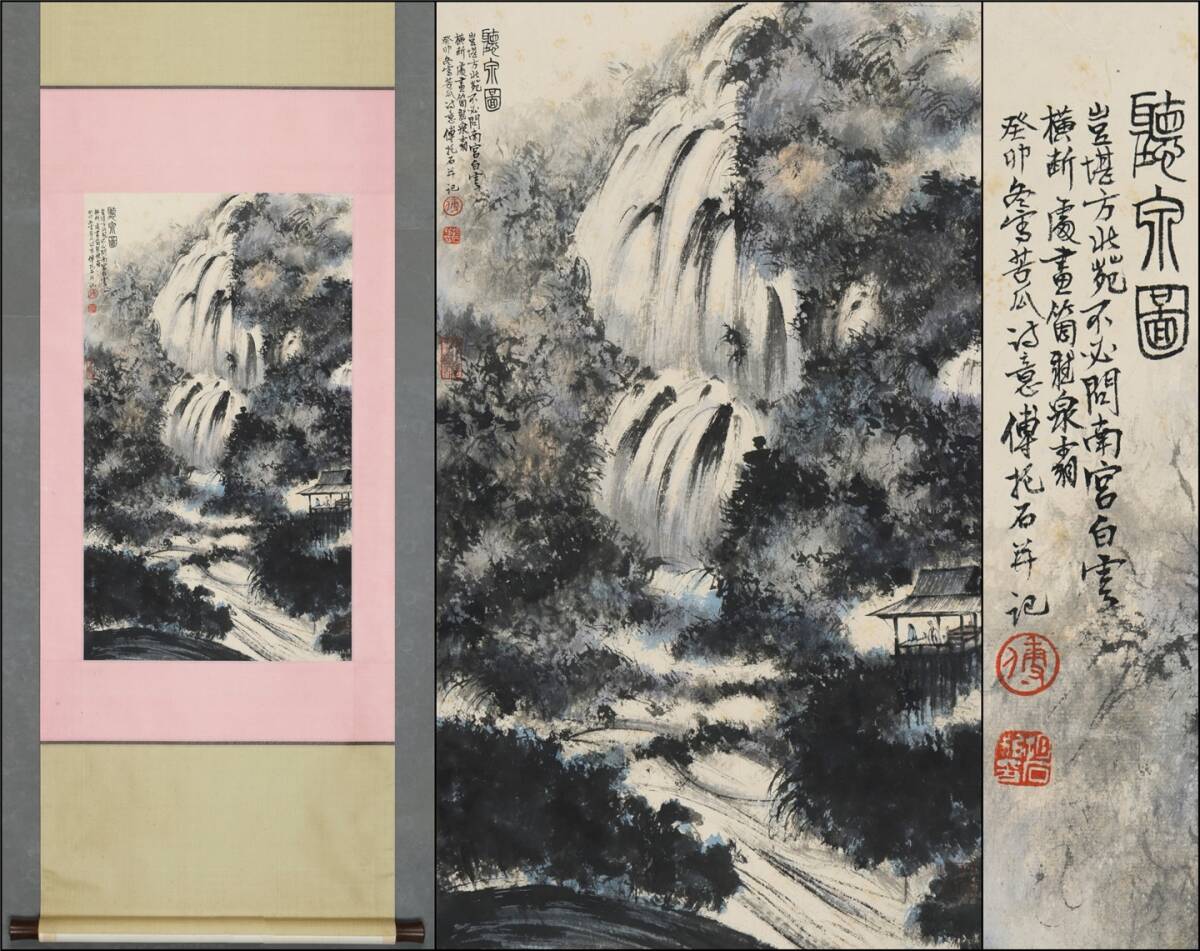 > 古美術 掛け軸 中国・近現代 「傅抱石書」 紙本 【聴泉図】 立軸 書道 巻き物 肉筆保証 唐物 古画 画心81x47cm LT-250838