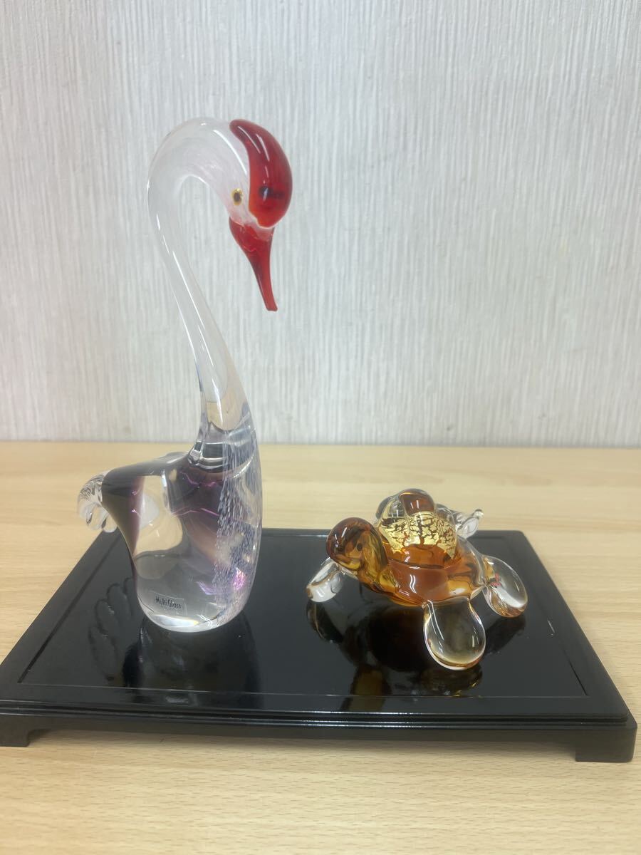 - 【ゆ80サイズ】 Multi Glass 鶴 亀 ペア 台座付き マルティグラス 置物 ガラス