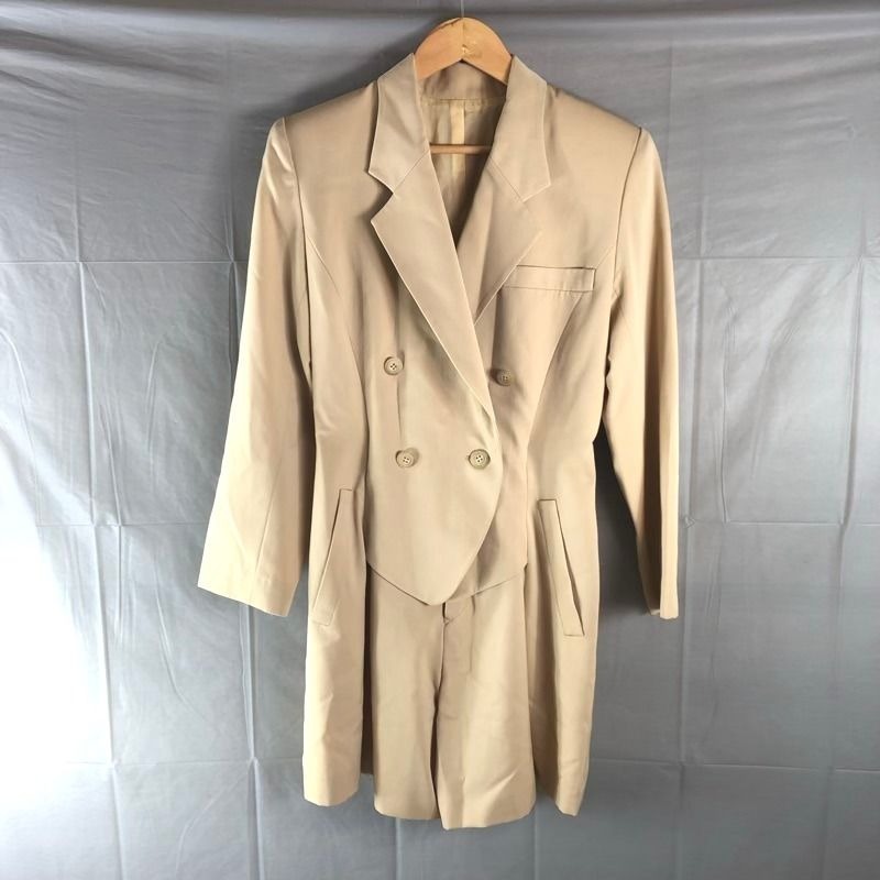 - マリココウガ Mariko Kohga コート パンツ仕様 ハーフパンツ ダブルボタン ベルト ポケット 肩パッド 日本製 ベージュ 2025063000024