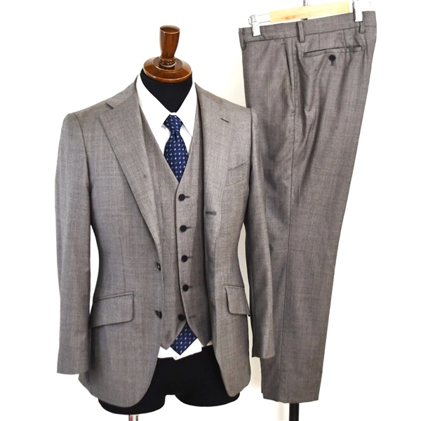 ・春夏対応。イタリア製カノニコSuper110's生地使用。ベスト付き。段返り。3つボタンシングル。袖口4つ釦本切羽。背抜き。サイドベンツ。フラップポケット。ネーム刺繍なし。