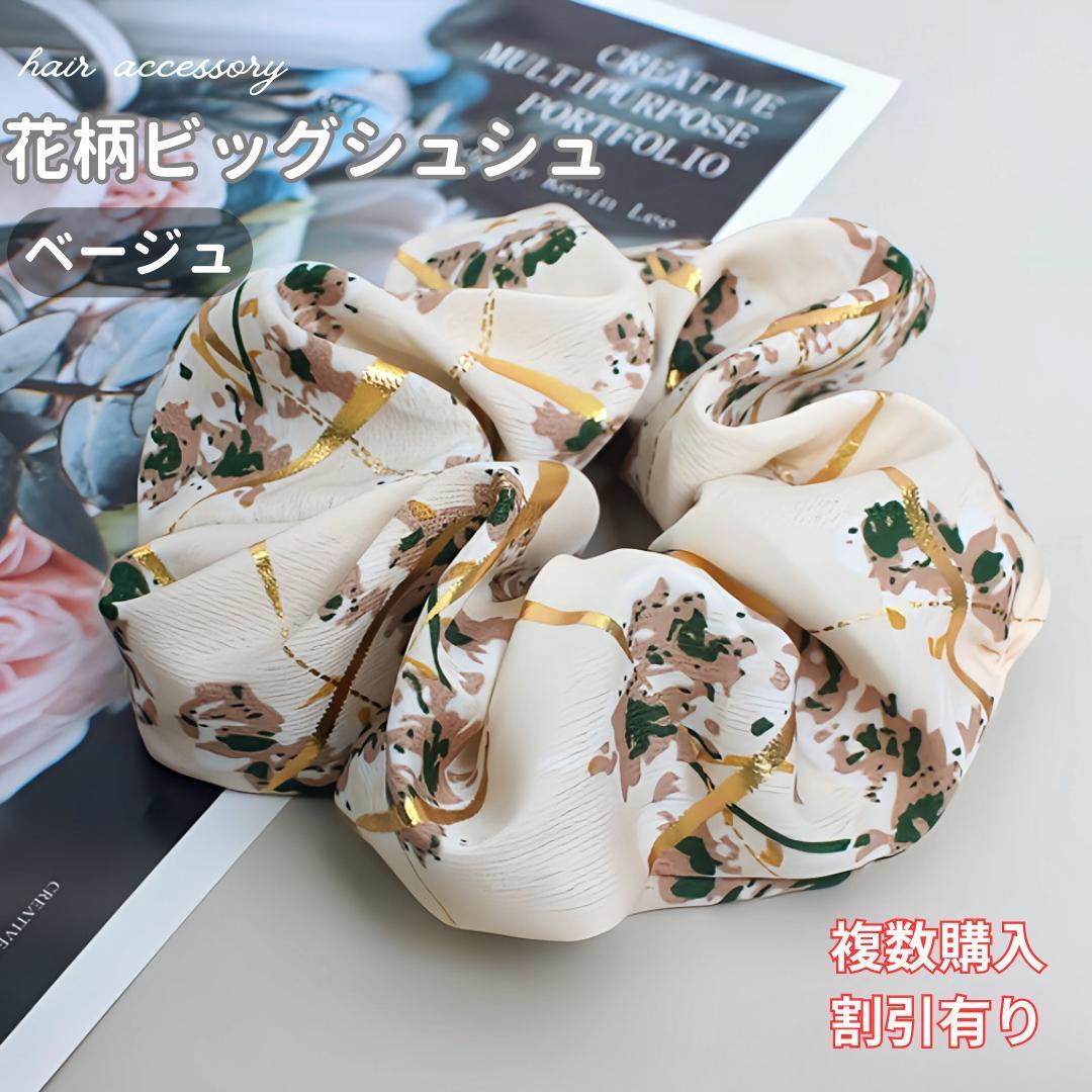 - ヘアアクセ 大きめ 花柄 シュシュ ベージュ ヘアゴム リボン 髪留め 髪飾り おしゃれ