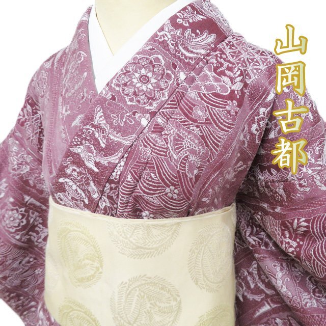 > 小紋 着物 未使用 正絹 単衣 カジュアル 山岡古都 天目織 花鳥模様 波 蘇芳香色 身丈156.5cm 裄62cm M きもの北條 A1257-9