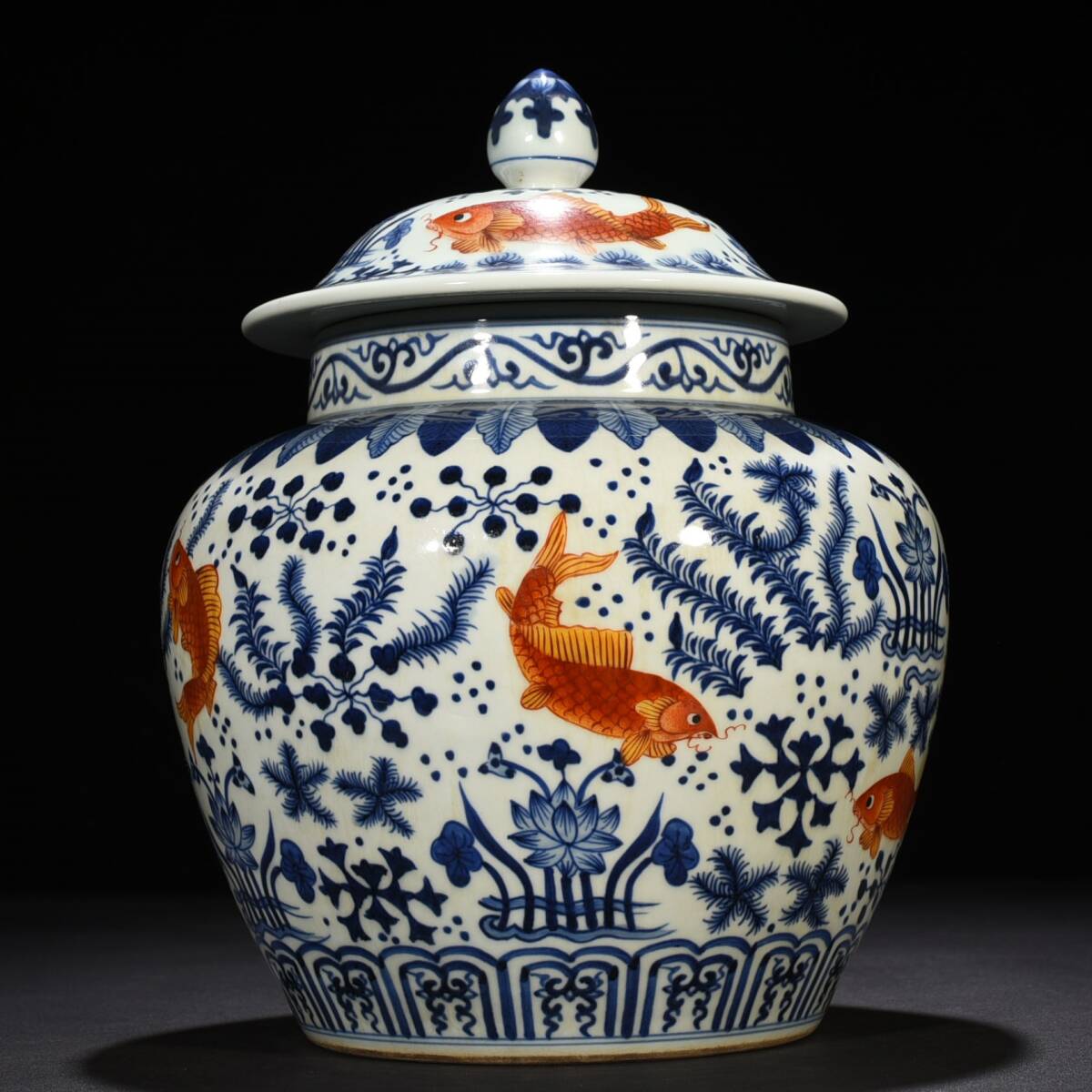 - 時代旧蔵 明時代 嘉靖年製 サバみょうばん紅 魚藻紋将軍缶 古陶磁器 珍品旧蔵 古賞物 時代物 818