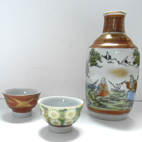 - 九谷焼★一若 六角徳利 老人・松竹梅文様 仙守 永楽 盃 花詰文様 雲文様 2種