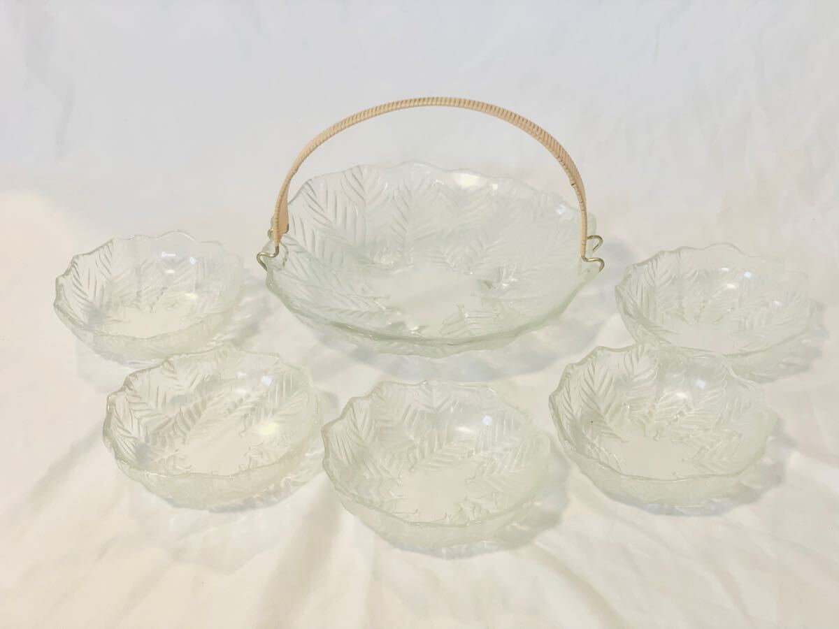 - 未使用 櫟 くぬぎ ガラス皿 大皿 小皿 取り皿 1枚+5客 蕎麦 素麺 足付 コンポート フルーツ 盛皿 着脱式 ハンドル セット 昭和レトロ