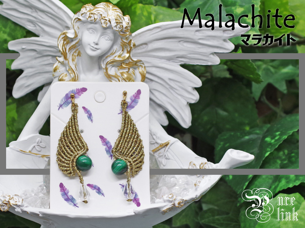 - 神と同じ名を持つ魔石・孔雀石『マラカイト』天使の翼マクラメ編みピアス《樹脂ピアス/天然石アクセサリー》