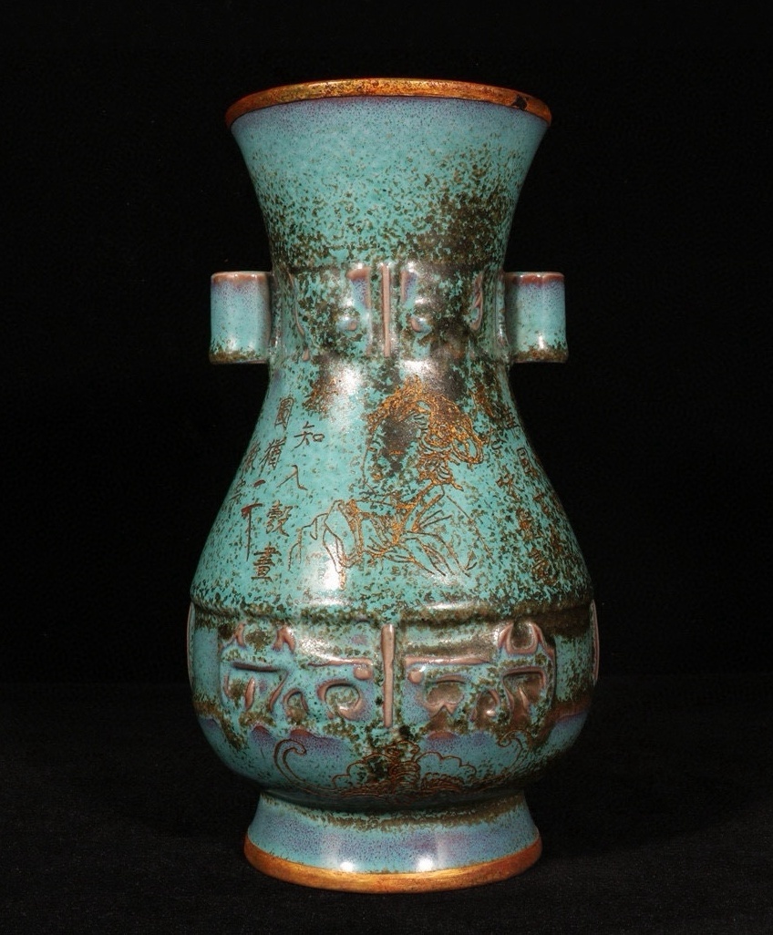 - 宋時代 唐物 鈞窯 奉華金蒔絵金 貫耳瓶 陶磁器 中国美術 古美術 置物 高さ22 cm 直径12 cm 819