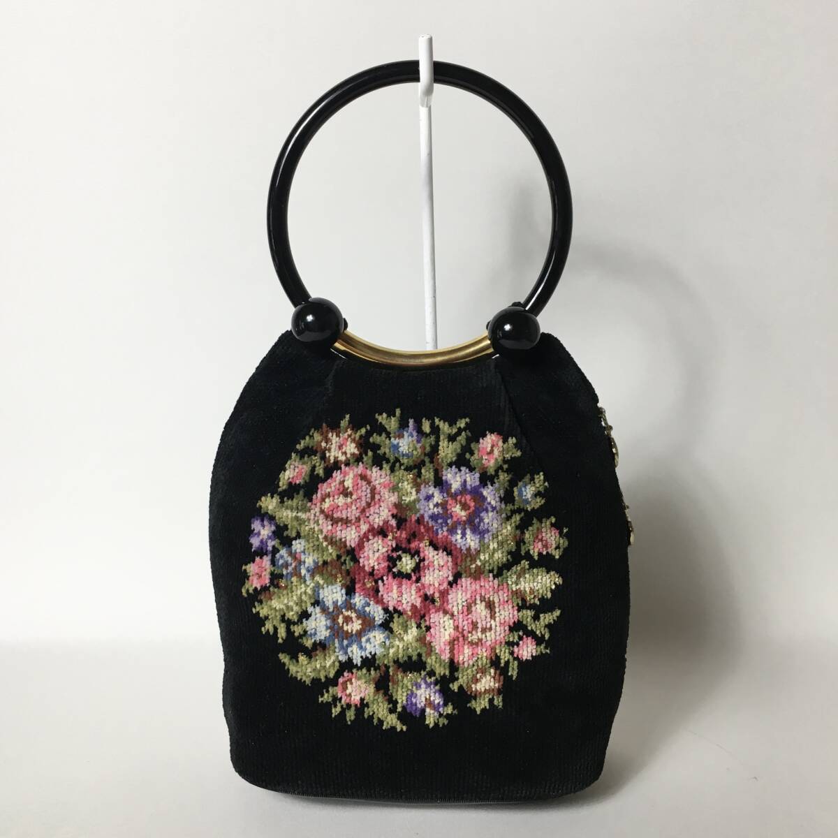 - 78B53|美品|フェイラー ハンドバッグ シュニール織 ブラック 花柄刺繍
