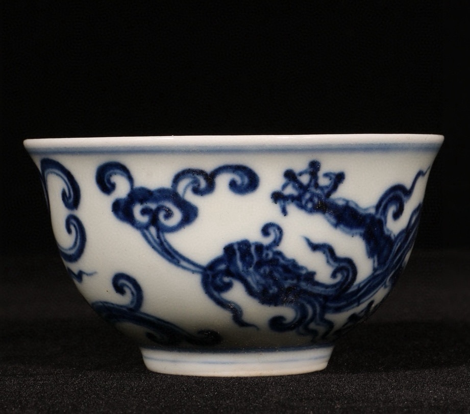 > 明時代 唐物 宣徳年製 青と白の 龍紋杯 陶磁器 中国美術 古美術 置物 高さ4.5 cm 直径8.5 cm 819
