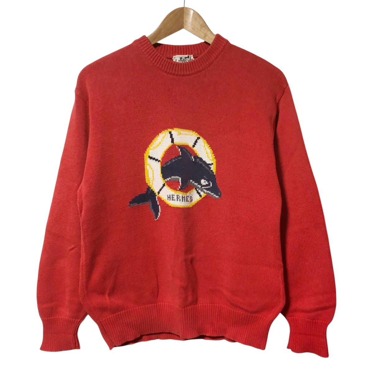 - HERMES エルメス ヴィンテージ ニット セーター イルカ柄 ロゴ 長袖 48 赤 メンズ A20